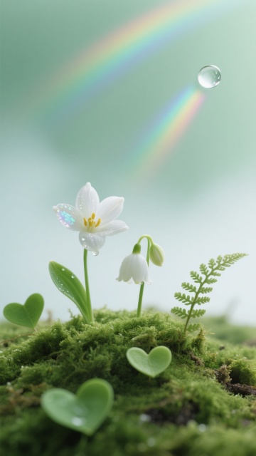 超写实摄影风格,俯视角微距镜头下的晨雾弥漫古老森林地表,画面以清新柔和的浅绿色渐变背景为主,营造宁静自然的氛围。前景是覆盖着绒毯般鲜绿苔藓的地面,苔藓呈现出细腻的纹理和饱满的质感,其间点缀着半透明的蕨类嫩芽和三朵顶戴珍珠晨露的白色小蘑菇,中央位置一块布满深绿苔藓的不规则灰黑色岩石被细密的银灰色菌丝网络温柔托举,岩石表面镶嵌着几粒折射彩虹光晕的露珠,边缘略显粗糙,整体形态自然质朴。构图采用近景特写,主体明确,景深控制得当,背景是逐渐虚化的深绿蕨类植物墙,空气中悬浮着肉眼可见的微小水汽颗粒,光线柔和均匀,从上方树冠缝隙中投下柔和晨光,在苔藓和岩石表面形成斑驳的金色光斑与微妙的光影变化,高光处露珠闪闪发光,阴影部分自然柔和,整体色调是多层次翡翠绿与苔藓灰的和谐交融,传达出清新、静谧、充满生机的自然之美。