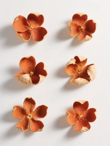白色背景,六个规整排布的陈皮系列素材集合,每个元素内容完全不同,保持高清晰摄影写实风格,光影自然柔和,主体突出,细节丰富,色彩分别变换为:深褐色陈皮丝、橙黄色陈皮片、暗红色陈皮块、浅棕色陈皮条、橘红色陈皮碎、棕黄色陈皮圈,每个陈皮元素形态各异,纹理清晰,质感真实,整体构图平衡,设计感强,适合作为产品展示素材。