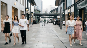 超写实风格商业步行街黄昏场景,暖金色夕阳低角度照射,天空呈现渐变的蓝紫色与粉橙色云彩,现代风格多层商铺建筑,玻璃幕墙与木质、金属材质结合,底层商铺灯火通明,行人悠闲漫步,远处城市高楼剪影,地面光洁反射光影,整体氛围繁华、时尚、充满活力,具有高端商业地产的视觉质感与吸引力,构图采用透视线引导,视觉焦点集中在步行街中央区域,光影对比鲜明,细节丰富,符合商业宣传所需的高品质、吸引人的场景呈现。