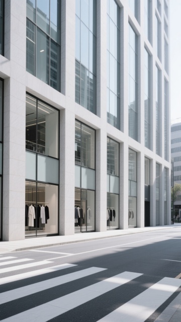 极简主义风格的现代城市建筑群,从低角度仰望视角,以几何线条和简洁形态构成的摩天大楼,大面积的玻璃幕墙与金属框架形成鲜明对比,整体采用黑白灰三色的高级色调,画面干净利落,光线柔和均匀,建筑轮廓清晰锐利,天空留白处理,营造出冷静、理性、未来感的都市氛围,无任何多余装饰元素,突出建筑本身的结构美与秩序感。