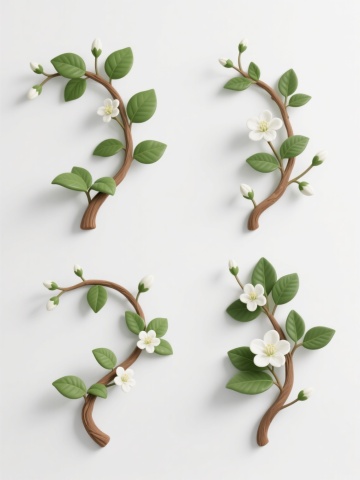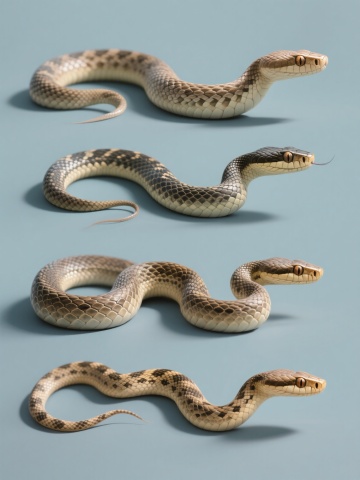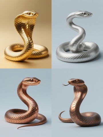金色剪纸风格的蛇素材合集,纯色背景,上下两行整齐排列共四个不同造型和样式的蛇,每个蛇都具有流畅弯曲的身体、精致的头部轮廓和独特的蜷曲姿态,蛇身装饰着对称的白色花卉图案(包括樱花、梅花、菊花等不同样式),周围环绕着形态各异的金色花叶元素,整体保持统一的金色渐变色调、细腻的镂空剪纸纹理和传统吉祥图案风格,视觉层次清晰,单个蛇造型独立且各具特色,排列整齐有序。
