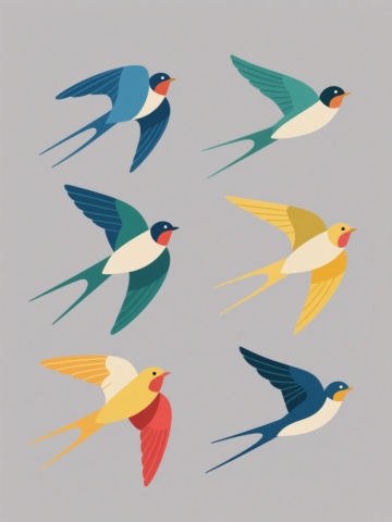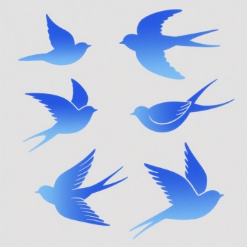 纯蓝色渐变手绘风格飞鸟图案集合,6款完全不同形态的蓝色系鸟类剪影,每款均采用简洁流畅的线条勾勒,翅膀与尾羽带有细致的锯齿状纹理,整体造型轻盈灵动,保持统一的单色渐变填充和简约手绘质感,规整排布于纯色背景上,风格统一且元素各异,呈现出系列化的装饰图案设计感。