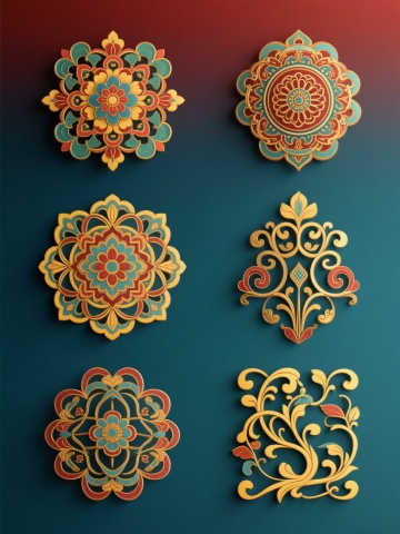 纯色背景,保持原3D质感渐变与厚重装饰纹样风格,整体色彩变换为[可替换为具体色系,如:深蓝与金色系/绯红与墨绿系/明黄与靛蓝系等],画面中呈现6个完全不同的敦煌风格装饰元素,包含花卉、几何纹样、植物藤蔓等同类目元素,所有元素规整排布,形成系列素材集合,每个元素细节丰富,线条繁复精致,具有传统敦煌艺术的华丽感与对称美感,视觉层次清晰,整体设计感强,适合作为装饰图案集合使用。