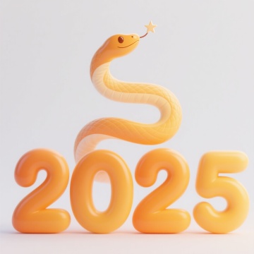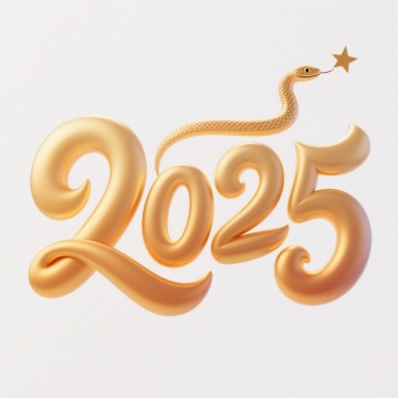 软3D风格的数字“2025”艺术设计,整体采用渐变的暖金色调,字体呈现圆润流畅的手写体风格,笔画边缘柔和且带有轻微的立体凸起效果,数字“0”的上方巧妙融入一条简约的蛇形图案,蛇头顶部点缀着一颗小巧的五角星,所有元素在纯白色背景上形成鲜明而和谐的视觉对比,整体造型兼具现代感与节日般的欢庆氛围。