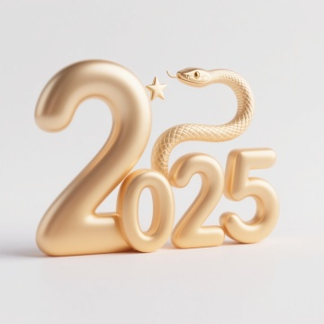 软3D风格的“2025”数字设计,整体采用柔和的渐变金色调,数字边缘圆润无棱角,具有轻微的立体浮雕感,表面光滑细腻,光影过渡自然柔和,没有强烈明暗对比。在数字“2”的尾部上方有一条简约抽象的蛇形轮廓,蛇头微微抬起,蛇身上方有一颗小巧的五角星装饰,整体构图简洁大气,充满现代感和节日氛围,背景为纯白色,突出主体数字和蛇形元素。