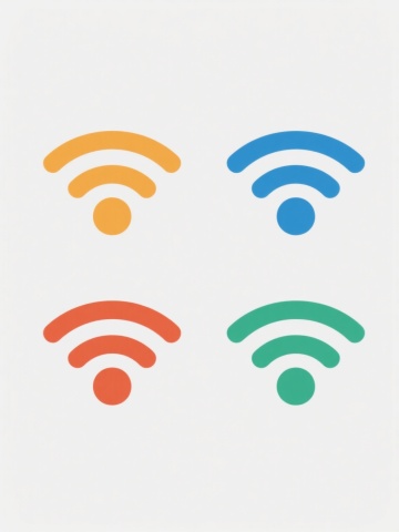 一组四个简约风格的单色图标,每个图标均为扁平设计,线条简洁流畅,边缘圆润,无渐变无阴影,具有高度的符号化特征,分别代表不同的科技或通讯相关元素:第一个图标为蓝色的Wi-Fi信号塔,第二个为绿色的卫星天线,第三个为紫色的雷达扫描装置,第四个为橙色的手机信号发射器,所有图标均置于纯白色背景上,呈2x2网格规整排布,整体保持统一的视觉语言和设计风格。