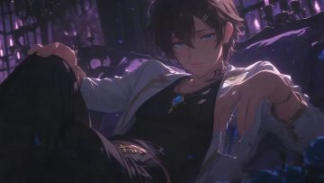一个帅气的少年,粉发碧眼,帅气阳光,白色衬衫,打领带,型男发型,白皙的皮肤,面部特写,树影斑驳,蓝色花瓣飘落,背景是花海
