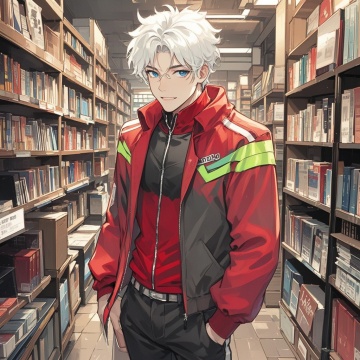 现代感动漫风,机能风设计,角色身着红色夹克,置身书海,展现科技与文化的融合。