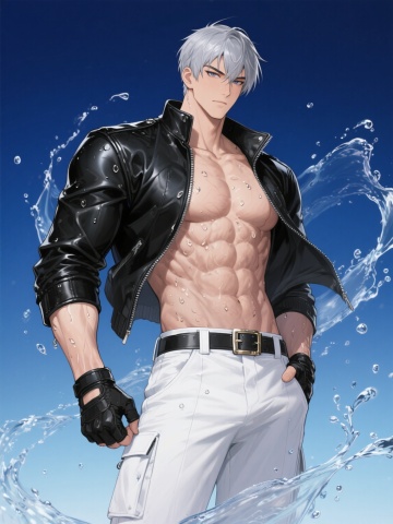 日系动漫风格男性角色插画,健壮肌肉主题,白色背景,手绘质感笔触,柔和光影,男性角色有着凌乱的棕色短发,锐利的蓝色眼眸,嘴角带着自信的微笑,上身穿着一件黑色高领无袖紧身衣,左手正将衣服下摆向上拉起,露出线条分明的八块腹肌和结实的胸肌,右臂自然下垂,手插在黑色裤子口袋里,整体姿态展现出力量感与性感,肌肉轮廓清晰,阴影过渡自然,色彩以黑色和肤色为主,形成鲜明对比,人物表情邪魅又带点慵懒,展现出独特的魅力。