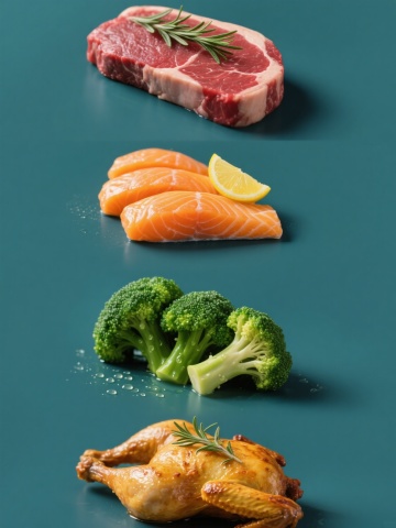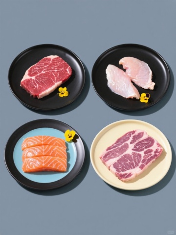 超写实摄影风格,4个规整排布的顶级美食特写,分别为不同的五分熟美食,展现完美色泽与纹理,光线斜上照射突出细腻质感,纯色背景鲜明主体,简约现代造型,无文字、logo、水印,包含不同诱人食物,呈现高品质食材新鲜感与烹饪美味。