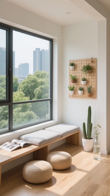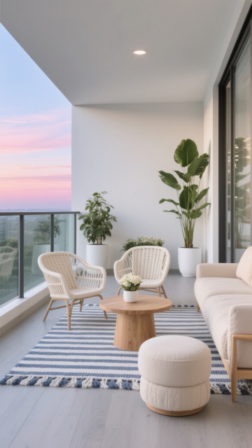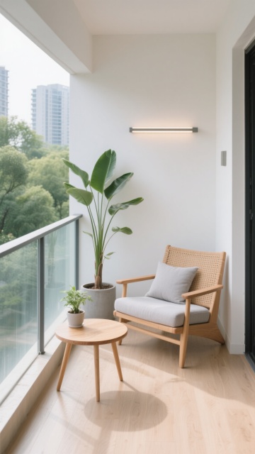 现代简约风格阳台场景,干净明亮的设计,浅色木质地板,白色墙壁,黑色金属框架玻璃护栏,左侧摆放浅灰色布艺沙发配同色系靠垫,右侧是木质休闲椅,旁边有一个圆形木质小边几,角落放置一盆绿色植物,墙上装有简约壁灯,窗外可见绿色树木和远处建筑,自然光充足,光影柔和,整体氛围宁静舒适,摆设符合现实逻辑,适合作为背景素材使用。