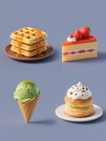 一套四个不同元素的系列素材集合,每个元素均采用圆润可爱的3D立体卡通风格,拥有光滑的表面质感和柔和的渐变色彩,高光部分明亮突出,底部带有淡淡的阴影效果,整体呈现出温馨甜美的氛围,元素被规整地排布在纯色背景上;第一个元素是一个蓝白渐变的双层生日蛋糕,顶部插着一根红白条纹的点燃蜡烛,旁边有一个黄色星星形状的饼干,蛋糕表面覆盖着白色奶油,边缘有波浪形花纹;第二个元素是一个粉紫渐变的三层冰淇淋甜筒,最上面是一个粉色的樱桃,甜筒表面有白色的糖粒,每一层冰淇淋的颜色由下至上逐渐变浅,底部是棕色的脆筒;第三个元素是一个黄绿渐变的圆形饼干礼盒,礼盒上系着一个粉色的蝴蝶结,礼盒表面有白色的波点图案,礼盒的盖子微微打开,露出里面的几块不同形状的饼干;第四个元素是一个橙红渐变的圆形甜甜圈,甜甜圈表面覆盖着橙色的糖霜,上面撒着白色的糖屑,中间的孔洞周围有一圈白色的奶油花边,顶部放着一颗红色的草莓。