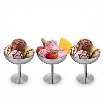 色彩鲜艳的写实风格冰淇淋球组合,透明雕花玻璃高脚杯盛放,三个不同口味的冰淇淋球堆叠:深棕色巧克力口味带细腻波纹,白色香草口味点缀黑色巧克力碎,浅棕色香草口味顶部装饰黑色几何图案巧克力片,右侧有螺旋状奶油,杯壁内侧底部有彩色水果丁(红色樱桃、黄色芒果块),两根棕色酥脆蛋筒斜插在冰淇淋球后方,整体光影明亮柔和,高光突出冰淇淋的丝滑质感和玻璃的透明光泽,色彩饱和度高且对比鲜明,构图饱满居中,背景为纯白色。
