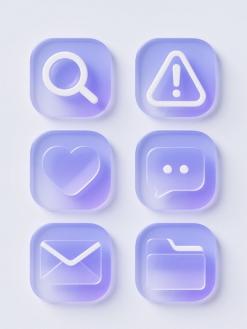 一套6个完全不同造型的系列UI图标集合,保持现代简约的半透明玻璃拟态风格,每个图标都具有精致的白色描边轮廓、光滑的渐变填充、微妙的高光和阴影效果,呈现出柔和的立体感和通透质感,整体采用统一的圆角设计语言,图标内容分别为:1. 放大镜搜索图标,2. 三角形感叹号警告图标,3. 气泡对话框图标,4. 心形图标,5. 信封邮件图标,6. 文件夹图标,所有图标规整地以2x3网格形式排布在纯白色纯色背景上,画面整体色彩变换为清新的蓝紫色调,图标之间保持均匀一致的间距,整体视觉效果简洁、现代且富有层次感,适合用于移动应用或网站的界面设计素材。