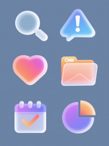 一组6个完全不同造型的3D半透明玻璃拟态UI图标系列素材集合,保持原有玻璃质感、立体光影效果和简约几何造型风格,整体色彩变换为[请在此处插入目标颜色,如:清新绿色/活力橙色/优雅紫色/沉稳灰色/温暖粉色/深邃蓝色],每个图标包含放大镜、感叹号警告、对话框、心形、信封、文件夹、日历、饼图等基础功能元素,以3行2列规整排布在纯色背景上,图标边缘有精致白色高光描边,内部有半透明渐变填充,呈现出光滑圆润的曲面和柔和的反光效果,整体视觉统一且具有现代科技感。