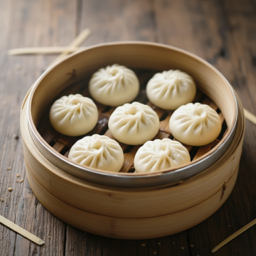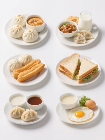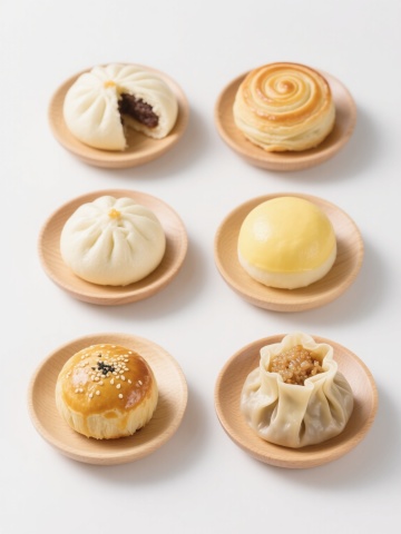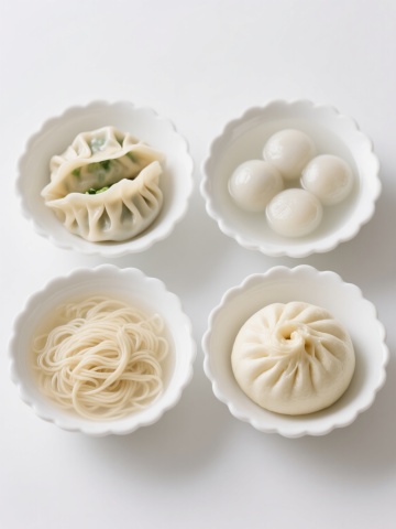 一组四个完全不同面食元素的系列插画,保持手绘水彩风格,白色纯色背景,规整排布。左上为一盘热气腾腾的蒸包子,褶皱清晰,露出部分馅料;右上是一碗撒着葱花的汤面,面条细长,汤色清亮;左下是一笼灌汤包,皮薄透亮,托盘里有汤汁;右下是一盘煎饺,底部金黄酥脆,搭配一小碟醋。每个面食都有精致的细节和柔和的色彩过渡,整体风格统一,充满温馨的美食氛围。