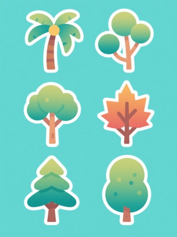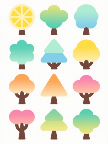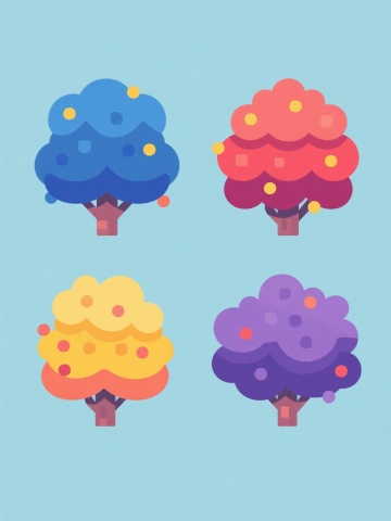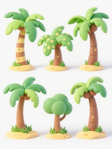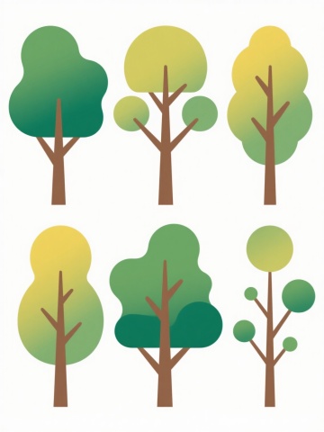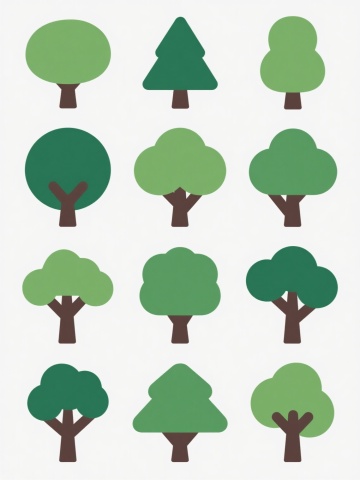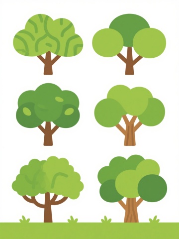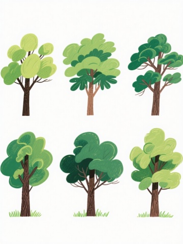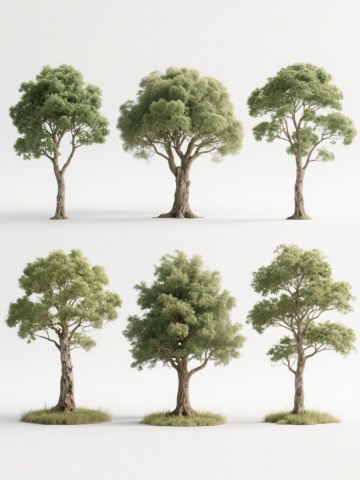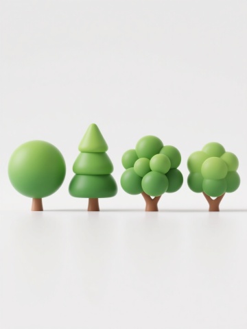 4棵不同品种、不同样式、不同外观的树木,白色背景,排列整齐,3d卡通风,树木拥有圆润饱满的树冠,树干为棕色,树冠为不同深浅的绿色,带有明显的明暗交界线和体积感,风格统一,色彩明快,简洁干净的画面,适合作为插画或设计元素使用。