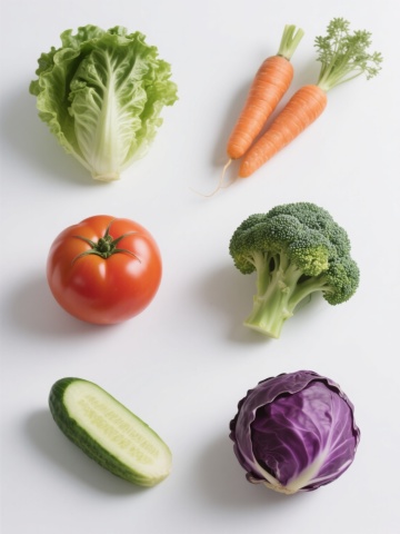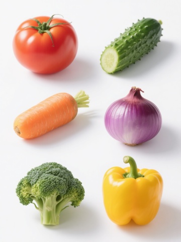 一张以纯白色为背景的蔬菜系列素材集合海报,保持与原图一致的高清写实摄影风格,光线明亮柔和,色彩鲜艳饱满且自然真实,蔬菜表面纹理清晰可见,拥有自然的高光和阴影细节。画面中规整排布6个完全不同类型的新鲜蔬菜,每个蔬菜都占据独立且均衡的视觉空间,包括:饱满的红色番茄、翠绿带刺的黄瓜、橙黄色的胡萝卜、紫色的洋葱、绿色的西兰花和黄色的甜椒。整体构图平衡对称,视觉层级清晰,突出蔬菜的新鲜感和多样性,信息传达直接高效,符合健康食品或生鲜产品的宣传目的,设计简洁大方,具有现代感。
