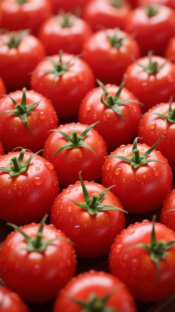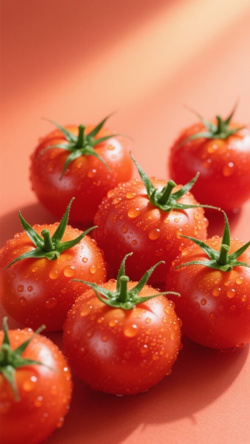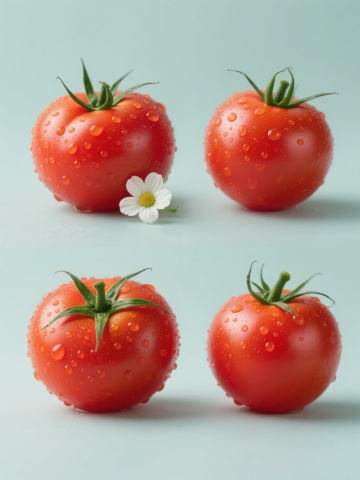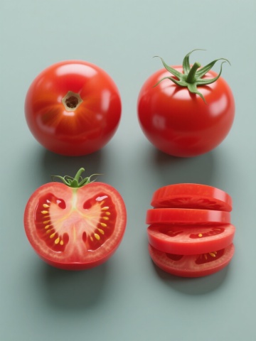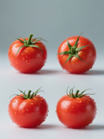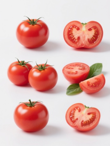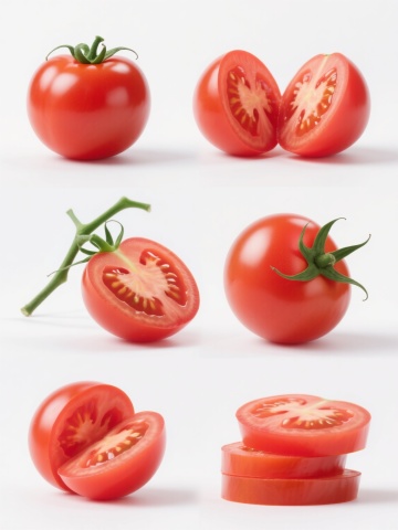四个不同造型样式的番茄以规整排布方式呈现,包括完整带叶番茄、半切开露出红色果肉与黄色籽粒的番茄、不同角度摆放的完整番茄、带些许自然褶皱的番茄,均采用超写实摄影风格,表面光滑有明亮高光,红色果皮色泽饱满鲜艳,绿色果蒂纹理清晰,整体光影立体感强,纯白色纯色背景,无任何文字、logo及水印。