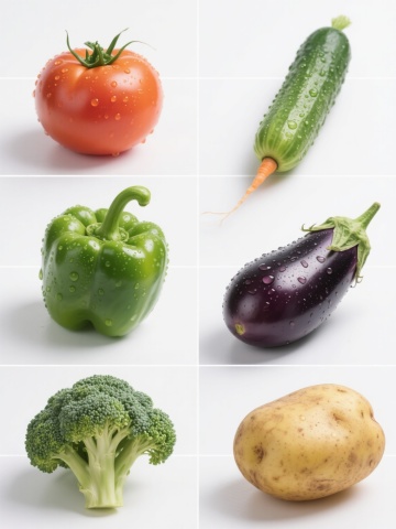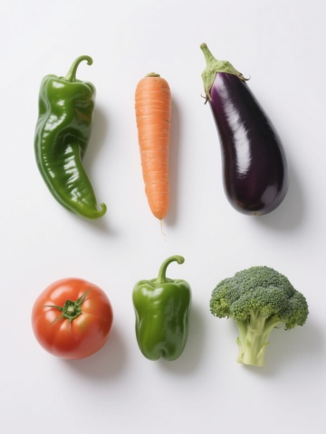 超写实摄影风格,纯色白色背景,六个完全不同的新鲜蔬菜元素(胡萝卜、西红柿、黄瓜、茄子、青椒、西兰花),每个蔬菜保持与原图辣椒一致的高清晰细节、饱满色泽、自然弯曲形态和真实光影效果,表面具有细腻的纹理和高光反射,规整排列成两行三列的集合式构图,整体画面干净简洁,突出蔬菜的新鲜质感和生动形态,无任何文字、LOGO及装饰元素。