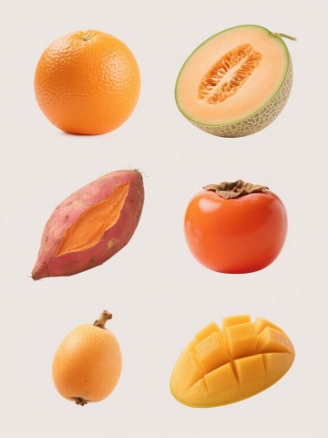 简约现代风格的纯色背景系列素材,单一橙色系元素图案规整排布,无任何文字、logo和水印。第一张:新鲜饱满的橘子,橙色果皮纹理清晰,果肉颗粒感十足,整体造型简约;第二张:香甜多汁的哈密瓜,橙黄色瓜肉搭配绿色瓜皮边缘,瓜瓤纹路自然分布;第三张:营养丰富的红薯,橙红色薯肉质感细腻,表面光滑;第四张:成熟诱人的柿子,橙红色果皮圆润饱满,带有自然的光泽;第五张:鲜嫩可口的枇杷,橙黄色果实小巧玲珑,果蒂清晰可见;第六张:香甜软糯的芒果,橙黄色果肉厚实,果核轮廓分明,整体设计简洁大方,保持统一的简约现代风格。