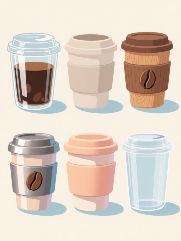 六个规整排布的咖啡杯系列插画,保持相同的带盖圆柱形杯身和咖啡豆图案元素造型,采用浅色背景,整体色彩变换为明亮清新的多色调组合,每个咖啡杯分别呈现完全不同的材质质感:第一个是光滑亮面的玻璃材质,带有通透光泽和折射光影;第二个是哑光陶瓷材质,表面细腻磨砂质感;第三个是木质纹理材质,呈现自然木纹和温暖色调;第四个是金属质感材质,带有金属反光和冷色调;第五个是软质硅胶材质,表面柔和有弹性;第六个是透明亚克力材质,半透明效果和轻微磨砂感,整体保持扁平化卡通插画风格,统一的光影处理和简洁的设计语言。