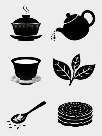 纯色背景上,以极简黑白剪影风格呈现的茶元素系列素材集合,包含六个完全不同的内容元素:1. 掀开盖子、蒸汽以颗粒质感螺旋上升的盖碗;2. 倾斜倒出茶水的茶壶,壶嘴有颗粒状水滴;3. 漂浮着茶叶的茶杯,杯沿有一圈颗粒纹理;4. 两片交叉的茶叶,叶脉以细密颗粒勾勒;5. 茶勺舀起茶叶的侧面剪影,茶叶呈颗粒状散落;6. 堆叠的茶饼,表面有同心圆颗粒纹路。所有元素均采用规整的几何剪影造型,边缘平滑,细节处运用点状颗粒质感表现烟雾、水滴、纹理等,整体排布整齐均衡,保持统一的极简设计感和黑白对比。