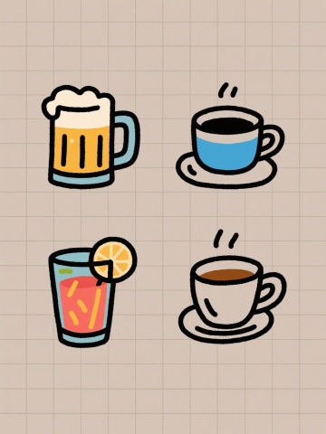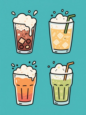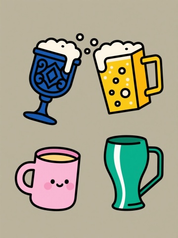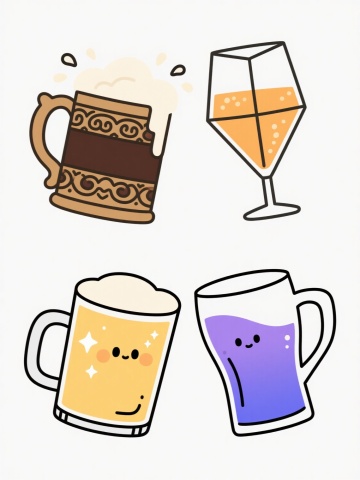 四个不同的手绘风格饮品插画,每个插画都有独特的色彩和元素,包括啤酒杯、咖啡杯、果汁杯和茶杯,采用黑色描边和纯色填充,背景为纯色,整体呈网格状排列,保持统一的手绘风格和简约设计感