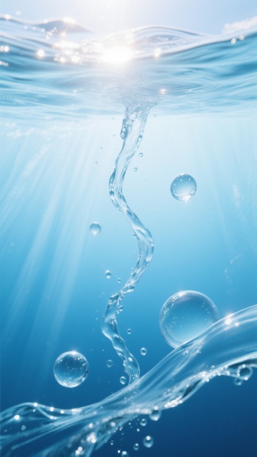 一张超写实摄影风格的海报,画面以清澈的蓝白渐变色调为主,上方是波光粼粼的水面,阳光从上方洒落,形成柔和的光斑和细腻的光影层次,水下呈现深邃通透的蓝色背景。主体是水下形态各异的水元素,包括向上喷涌的水柱形成优美的弧线、悬浮的水滴凝结成晶莹的水球、以及水在流动中形成的飘逸丝带状形态,水珠表面折射出璀璨的高光,边缘清晰锐利,整体营造出宁静、纯净且充满生命力的氛围,视觉焦点突出,信息传达简洁直观,符合追求自然美感与清新意境的设计感。