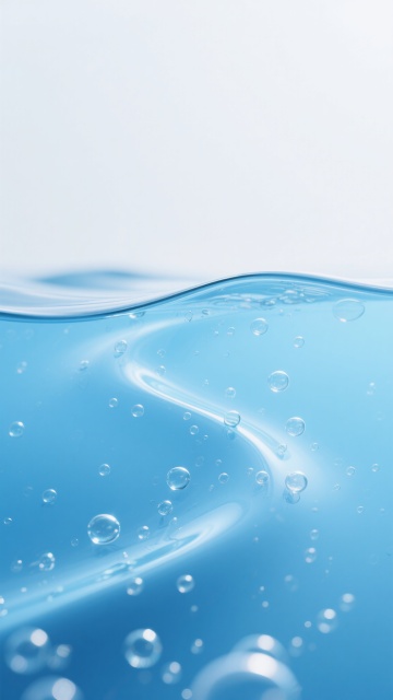 超写实摄影风格,纯净透明的蓝色水体,画面下方为渐变浅蓝色背景,上方为纯白色背景,水波以优美的S形曲线造型涌动,表面光洁如镜,反射着柔和的高光,大量大小不一、晶莹剔透的气泡附着在水面及水下,气泡边缘有清晰的光线折射效果,整体营造出清新、纯净、宁静的氛围,水质清澈见底,光影过渡自然柔和,细节丰富,具有高分辨率的质感表现。
