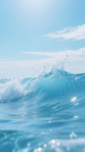超写实摄影风格,清澈透明的蓝色海浪涌起形成浪花,浪花顶部飞溅出多个大小不一的水珠,水珠在空中呈现晶莹剔透的质感,阳光照射下浪花边缘有明亮的高光和细腻的反光。海水表面有细腻且富有动感的波纹纹理,波浪呈现出柔和的曲线和层次感,海水颜色从近处的深蓝逐渐过渡到远处的浅蓝。背景为渐变的浅蓝色天空,天空中没有云层,纯净而开阔,整体画面营造出宁静、清新、充满活力的氛围,光影效果自然,水面波光粼粼,具有极高的细节清晰度和真实的水材质表现。