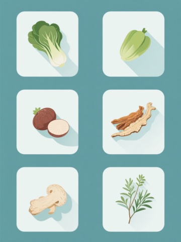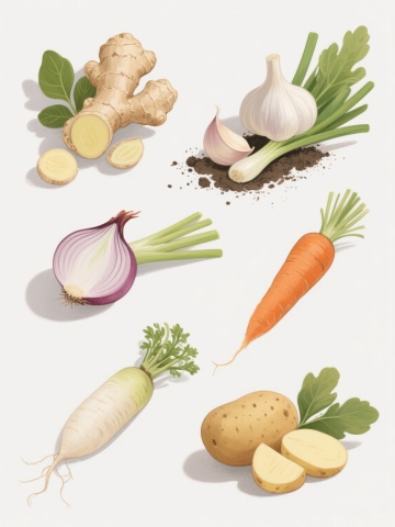 一系列四个不同根茎类蔬菜的插画集合,采用相同的扁平风格和手绘质感,每个蔬菜放置在不同纯色背景上(如橙色、绿色、紫色、黄色),保持相同的光影处理和简约线条,元素包括胡萝卜、白萝卜、莲藕和山药,规整排列成2x2网格,每个蔬菜都有简洁的轮廓和内部纹理细节,整体色彩明快协调,适合作为食材系列图标或包装设计素材。