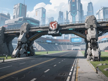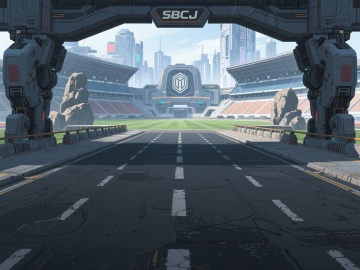 未来感科技赛场,赛博朋克风设计,虚拟现实体验,金属质感建筑。