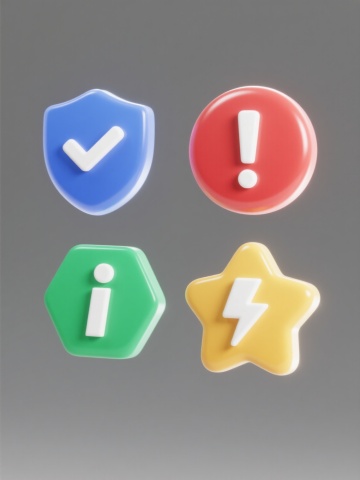 四个不同颜色的3D图标系列,金色盾牌带对勾、蓝色齿轮带箭头、红色星星带加号、绿色圆形带感叹号,每个图标都有六边形白色背景和精致的立体光泽效果,整体采用现代简约设计风格,图标排列整齐有序,纯色背景增强视觉冲击力,适合用于UI界面或移动应用的功能按钮设计