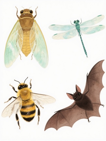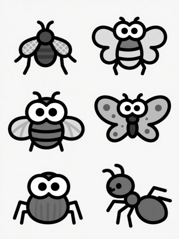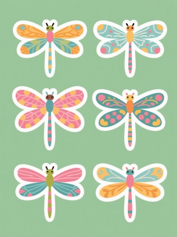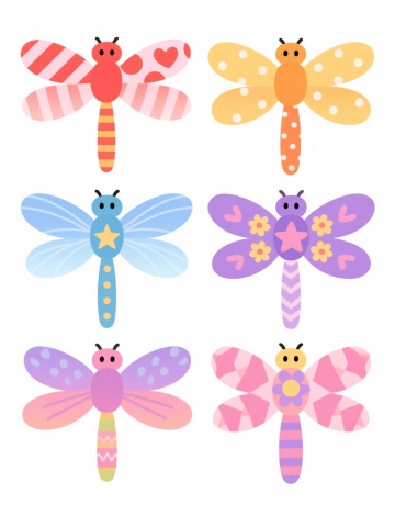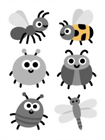 可爱卡通风格的六只不同昆虫规整排布插画,透明轻薄且带有细腻纹路的翅膀细节,柔和均匀的光影效果,简洁的纯色背景,整体画面明快活泼。画面中包含:一只翅膀呈渐变黄绿色的绿色蜻蜓,一只色彩斑斓翅膀带有花纹的蝴蝶,一只通体翠绿、翅膀透明带纹路、头部有明显复眼的知了,一只红色带黑色斑点的瓢虫,一只黄黑相间身体毛茸茸的蜜蜂,一只尾部带有发光黄色光点的萤火虫。所有昆虫造型均为可爱卡通化设计,线条圆润流畅,色彩鲜明柔和,整体构图平衡对称,视觉效果清新愉悦。