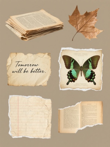 复古风格拼贴海报,纯色背景,六个规整排布的复古元素,每个元素边缘有自然撕裂效果和轻微褶皱纹理,整体色调为怀旧的米黄色、浅棕色和古旧纸张色,带有明显的岁月感和复古质感。左上角是一叠泛黄的旧报纸,纸张边缘磨损,隐约可见报纸的文字排版;右上角是一片干枯的银杏叶,叶脉清晰,叶片呈现自然干枯的棕褐色;左下角是一张带有红色网格线的旧稿纸,纸张质地粗糙,网格线条略显模糊;右下角是一只复古蝴蝶标本,翅膀上有绿色、棕色和黑色的花纹,翅膀边缘有轻微破损;左中是一张带有黑色手写体文字“Tomorrow will be better”的旧纸张,字体有手写感,略微倾斜;右中是一张边缘不规则的旧书页残片,纸张泛黄,隐约可见书页的印刷文字痕迹。所有元素在纯色背景上均匀分布,形成和谐的视觉平衡,整体营造出怀旧、复古、略带文艺气息的氛围。