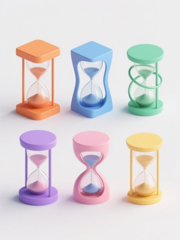 一套6张的3D风格系列素材集合,每张素材均为规整排布的单一闹钟图案,闹钟整体造型简约现代,采用纯色背景,无任何文字、logo和水印。第一张:红色渐变外壳的双铃闹钟,金色金属装饰,表盘中央有红色闪电图案,表盘为米黄色,金色刻度和指针,金色支架。第二张:蓝色渐变外壳的圆形闹钟,银色金属边框,表盘为白色,黑色数字和指针,顶部有一个银色提手。第三张:绿色磨砂质感的方形闹钟,黑色数字和指针,表盘为浅绿色,四个角有银色金属包边,底部有四个黑色防滑垫。第四张:黄色光滑外壳的卡通闹钟,造型像一个小房子,红色屋顶,白色表盘,黑色数字和指针,门口有一个小台阶。第五张:紫色透明外壳的球形闹钟,内部有蓝色LED灯,表盘为黑色,白色数字和指针,顶部有一个银色按钮。第六张:粉色软胶材质的椭圆形闹钟,表盘为浅粉色,金色数字和指针,顶部有两个粉色的小耳朵,底部有两个粉色的小脚丫。