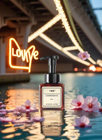 夜色下,湖水漾着暖光,“LOVE” 霓虹闪烁,产品伴樱花静立,浪漫的小确幸