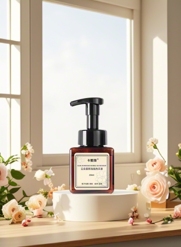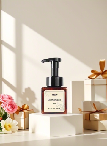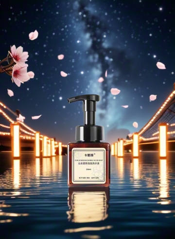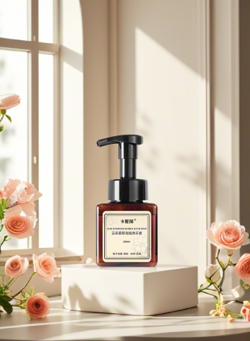 暖粉天空为底,搭配棕色产品、橙花与透明底座,色彩柔和雅致,营造出自然清新又治愈的氛围,尽显产品的温润质感