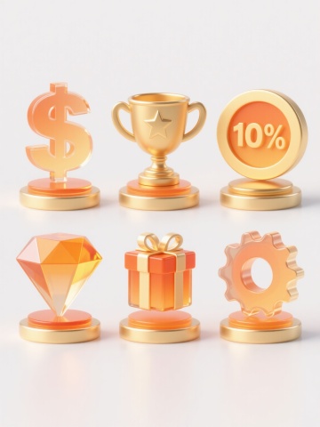 3D立体风格,金色渐变与橙色点缀,柔和顶光,轻微阴影,平滑数字艺术质感,简约构图,纯色背景。第一张:红包与金币组合,红包为传统样式,金色为主,点缀红色细节,金币环绕红包规整排布;第二张:数据图(柱状图或折线图,橙色箭头向上)与金币组合,数据图线条流畅,金币分布在图表周围;第三张:优惠券与金币组合,优惠券为矩形,带有折扣标识,金币在优惠券旁均匀排列;第四张:一堆金币,金币堆叠自然,有层次感,部分金币略微露出;第五张:购物车与金币组合,购物车为简约现代造型,金色为主,金币散落在购物车内外;第六张:手机与金币组合,手机为智能手机样式,屏幕可显示简单图标,金币围绕手机有序分布。每张素材均保持视觉层级清晰,元素排布规整,整体设计感统一,符合现代简约审美,信息传达高效。