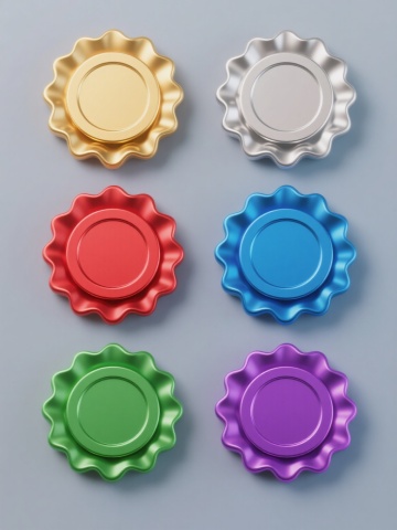 一组6个规整排布的素材集合,每个素材均为具有高度写实3D质感的圆形边框徽章设计,保持原有的经典月桂叶环绕、顶部和底部绶带装饰的对称结构,以及光滑金属表面的细腻高光和阴影细节,采用纯色背景,整体色彩变换为不同的金属色调(如金色、银色、铜色、玫瑰金、蓝色金属、黑色哑光金属),每个徽章样式在保持核心边框元素一致的前提下,细节上略有区分(如绶带褶皱的细微变化、月桂叶的疏密调整、金属表面的纹理差异、边框厚度的轻微改变、高光反射点的位置变化),所有素材排布整齐,视觉上形成统一而富有变化的系列感。