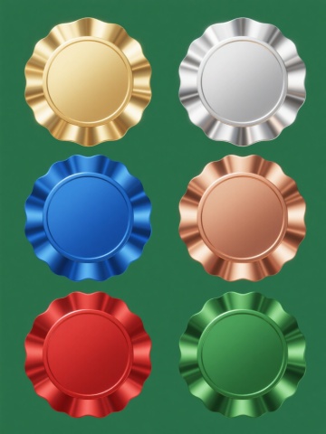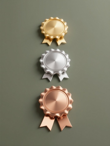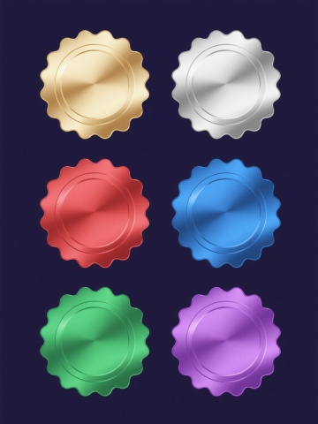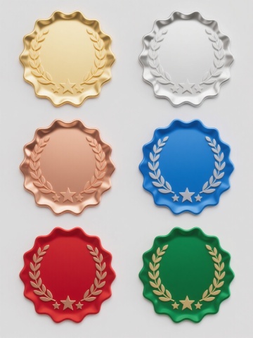 6个不同样式、不同材质的勋章,白色背景,排列整齐,每个勋章都具有鲜明的3D立体效果,采用光滑的金属质感,带有细腻的高光和阴影,边缘圆润,部分勋章带有星形、圆形等不同形状的轮廓,勋章下方配有飘逸的缎带,整体风格统一且精致,色彩丰富多样,包括金色、银色、铜色等不同金属色调,每个勋章都有独特的纹理和装饰细节,整体构图平衡,视觉层次分明,具有强烈的视觉冲击力和设计感。