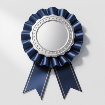 一个精致的3D质感奖章,主体部分改变为银色金属材质,呈现出光滑细腻的银白色金属光泽,带有柔和的反光和轻微的磨砂质感,奖章边缘保留原有的波浪形褶皱设计,褶皱处有清晰的高光和阴影过渡,中央圆形区域为平整的银白色金属面,周围环绕一圈细小的银色珠点装饰边框,奖章下方连接着两条深蓝色的缎带,缎带表面有光泽,带有金色的细线条装饰,缎带末端呈对称的V字形,整体悬浮在纯白色的纯色背景上,光影效果与原图保持一致,光源来自左上方,在奖章和缎带上形成自然的高光和阴影,立体感强,细节丰富。