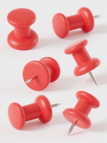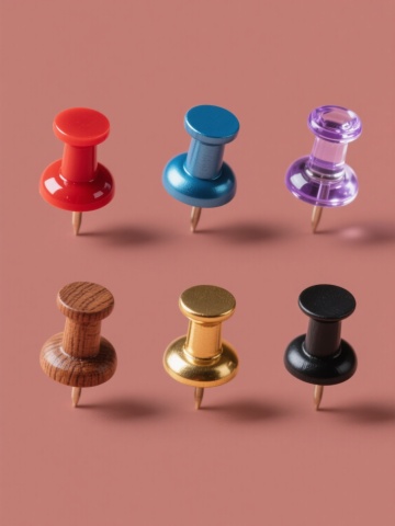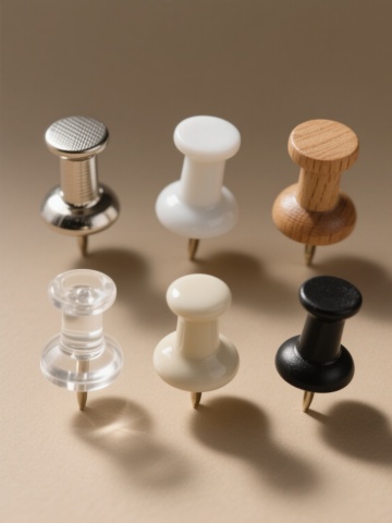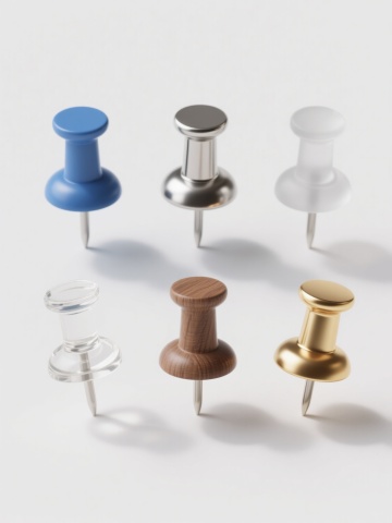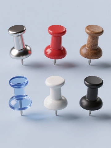 6个不同材质的图钉系列素材集合,规整排布在纯色背景上。每个图钉保持经典图钉造型(圆形平头、圆柱形钉身、尖细钉尖),但材质和视觉质感完全不同:1. 高光泽金属蓝色图钉,表面有强烈反光和细腻高光,呈现出光滑的塑料或金属质感,带有自然阴影;2. 哑光木质图钉,呈现原木纹理和温暖的木色,表面有细微的木纹肌理和柔和的漫反射光影;3. 透明玻璃图钉,清澈通透,带有玻璃特有的折射光影效果和轻微的蓝色调,钉尖为银色金属;4. 磨砂陶瓷图钉,表面粗糙有颗粒感,呈现均匀的白色,带有柔和的哑光光泽;5. 闪亮金色金属图钉,金属质感强烈,表面有精致的拉丝纹理,呈现出奢华的金色光泽;6. 柔软橡胶质感图钉,颜色为鲜艳的红色,表面有细微的防滑纹理,呈现出柔软有弹性的质感。所有图钉大小一致,以2x3的网格形式规整排列,每个图钉下方都有自然的阴影,整体画面简洁、现代、具有产品展示感。