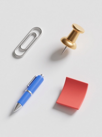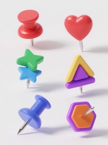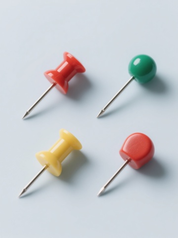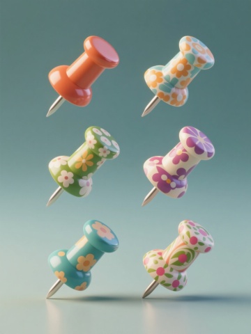 4个不同设计的彩色别针,采用简约现代风格,纯色背景,每个别针具有光滑圆润的3D塑料质感,色彩鲜明饱和,高光和阴影过渡自然,呈现出轻微的反光效果,整体造型简洁流畅,无任何文字、logo和水印,规整排布形成平衡的视觉构图。