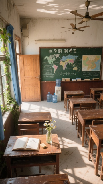 全景俯拍视角,在一座被晨光温柔唤醒的百年老校舍三楼走廊尽头,一间微微敞开着木门的教室正悄然诉说着时光故事——褪色的墨绿色黑板上用白色粉笔写着数学公式和几句潦草的励志格言,黑板边缘还挂着泛黄的世界地图,阳光透过爬满常春藤的玻璃窗,在地面切割出菱形光斑,光斑中漂浮着细小的尘埃。二十张核桃木课桌呈整齐的四列排列,每张桌面上都有深浅不一的刻痕,其中一张靠窗的课桌上,压着半块橡皮、翻开的语文课本(第三十七页的《从百草园到三味书屋》被阳光照亮),以及用玻璃瓶装着的野雏菊。教室后方的黑板报上用彩色粉笔绘制着"新学期新希望"的主题画,角落的饮水机旁堆着几个空水桶,墙角的老式吊扇正缓慢转动,在天花板上投下旋转的阴影,空气中弥漫着粉笔灰、旧书本和淡淡消毒水混合的味道,色调以温暖的赭石色木质纹理为基底,点缀着苔藓绿黑板与天蓝色窗帘的清新对比。