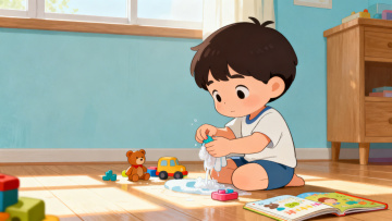 清新水彩插画风,卡通人物在溪流中嬉戏,尽显夏日欢乐。