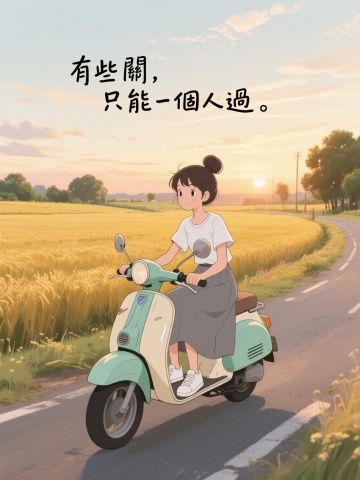 插画,5岁男孩,漫画,宫崎骏风格,小平头,白T恤,小白鞋。骑在一辆复古风格的薄荷绿与米白色相间的踏板摩托车上,乡村公路场景,公路旁是大片金黄色的田野,远处有树木,天空呈现出黄昏时分的暖色调,夕阳西下,天边有淡淡的云彩。手写艺术中文字“有些關,只能一個人過。”