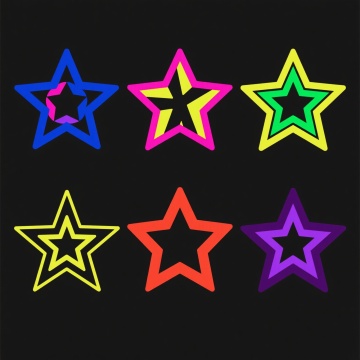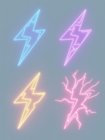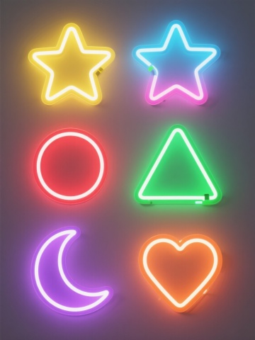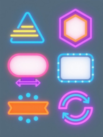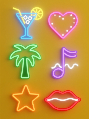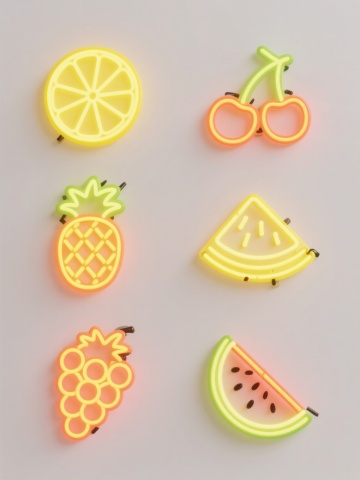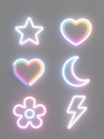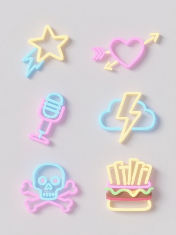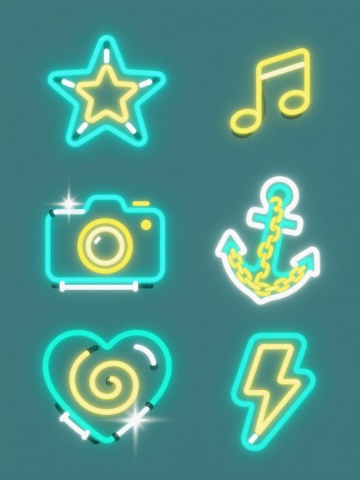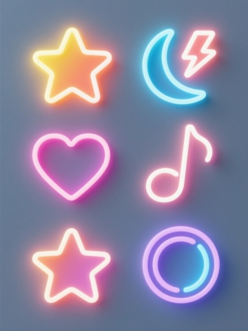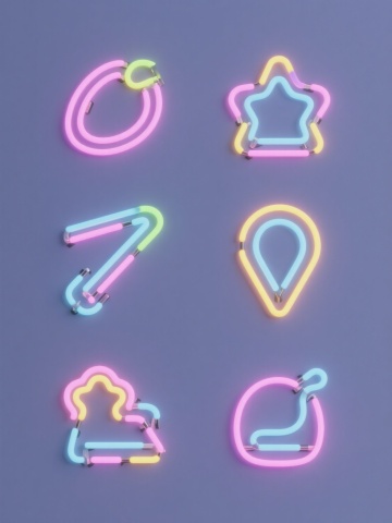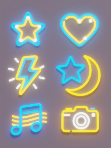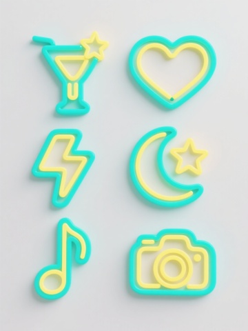 一系列六个完全不同造型的霓虹灯元素集合,采用简洁的线条风格,霓虹灯管发光效果,内部空心无填充,搭配明亮的彩色霓虹光(包括蓝色、粉色、黄色等)及柔和的光晕效果,纯色白色背景,元素包括:1. 蓝色霓虹酒瓶配黄色酒液飞溅和粉色条纹;2. 粉色霓虹灯爱心,边缘有蓝色光晕;3. 黄色霓虹灯星星,五个尖角,中心有蓝色小圆点;4. 蓝色霓虹灯音乐符号,八分音符造型,尾部有粉色波浪线;5. 粉色霓虹灯冰淇淋蛋筒,顶部有黄色螺旋状奶油;6. 黄色霓虹灯闪电符号,带有蓝色锯齿边缘,所有元素规整排列成两行三列,每个元素独立清晰,保持一致的霓虹灯发光风格和简洁设计语言。