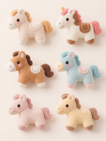 六个不同配色、不同样式的卡通布艺风格小马造型,每个小马都具有圆润可爱的身体、大大的眼睛、微笑的嘴巴和明显的缝线细节,整体呈现出柔软的毛绒玩具质感,上下两行整齐排列在浅色背景上。